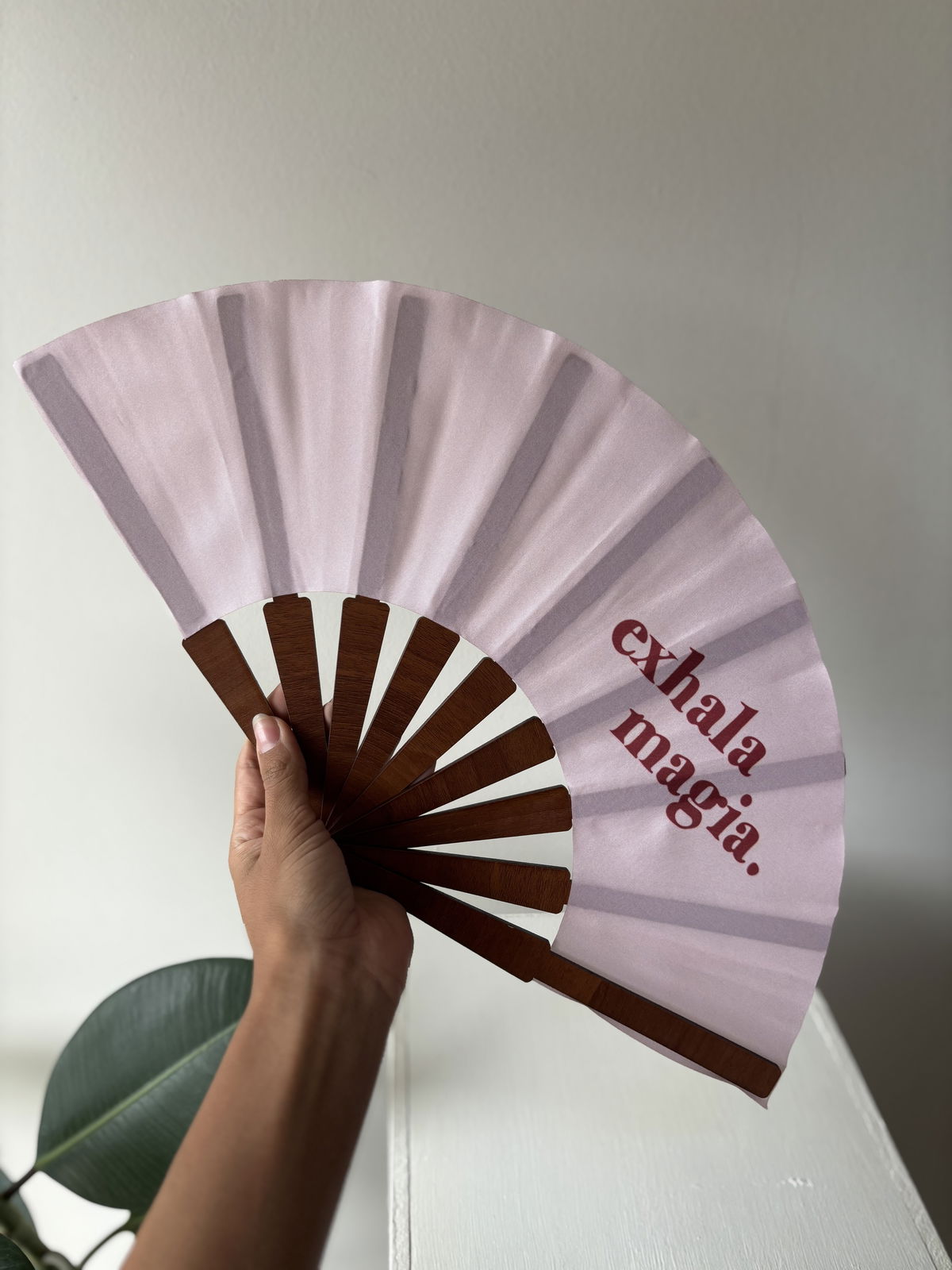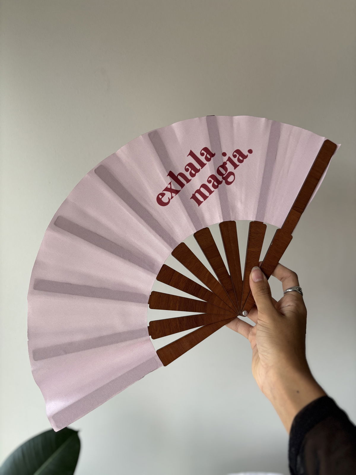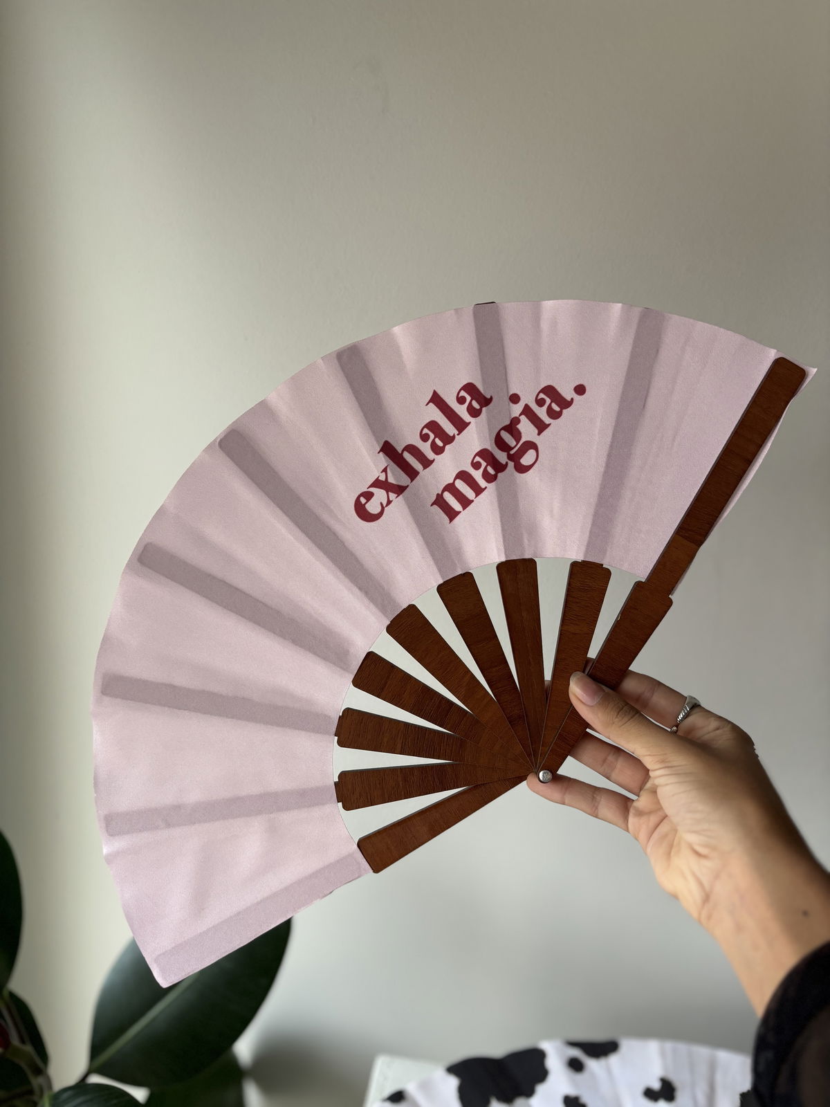 Abanico Premium de nueve varillas de madera fina con tela estampada.