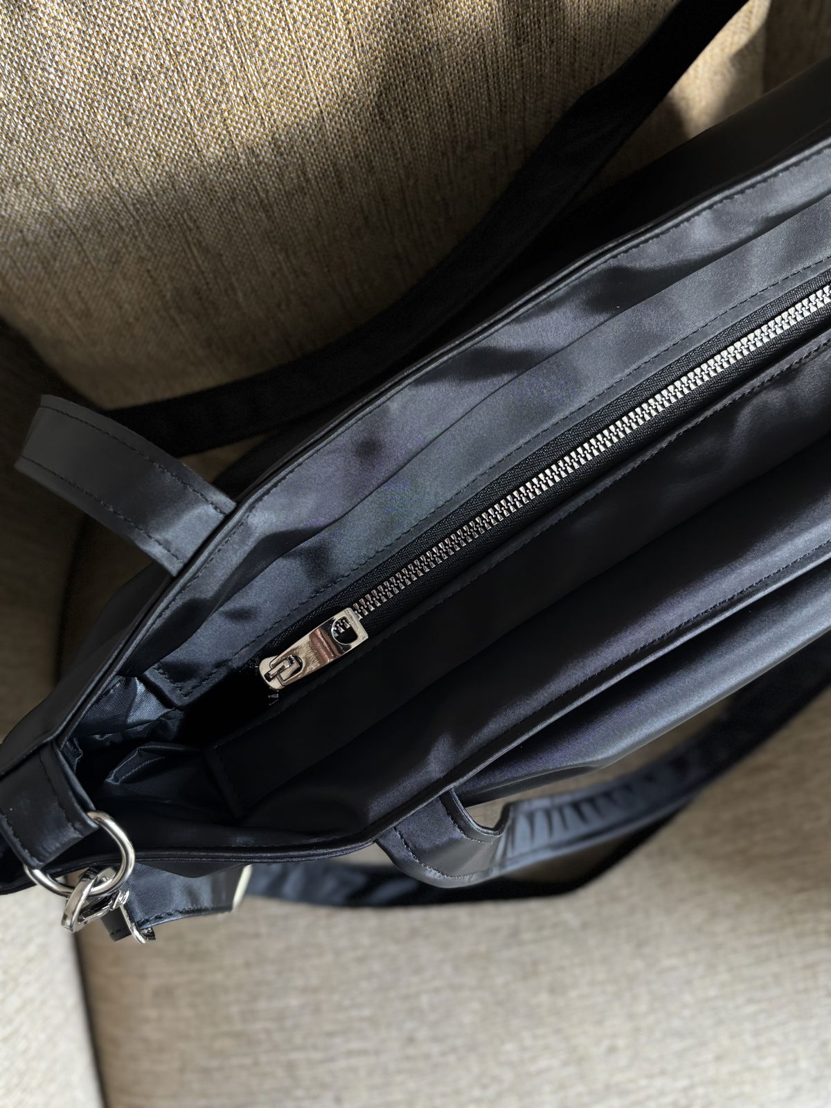 Forrado de tela en su interior con 3 bolsillos. Lleva un portallaves dentro.